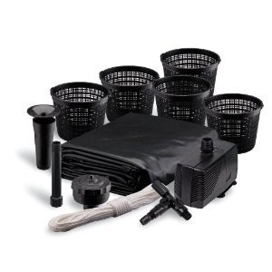 Kit includes 8 foot x 10 foot PVC liner, 450 GPH Pond Pump, 6 inch riser, Waterbell Nozzle, Cascade Nozzle, Diverter Valve, 5 Round Plant Baskets and 24 foot Measurement Rope.